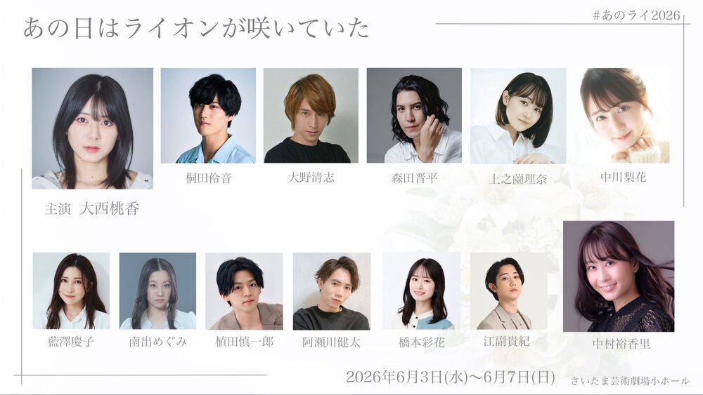 舞台「あの日はライオンが咲いていた」 SCHEDULE 2026/06/03(水) - 2026/06/07(日) さいたま芸術劇場小ホール 地図を表示 2026年6月3日〜7日 さいたま芸術劇場小ホール URLをコピーする 報告する